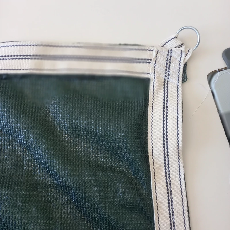 شید ۸۰درصد انتی یووی دار شرکت اکسیرساز شمال نوار پنبه ای سه خط ۴.۵ سانتی متری حلقه فلزی جوشی دوخته شده به فاصله هر یک متر سه دوخت محکم و عالی با نخ محکم ابعاد۳ متر در ۴ متر